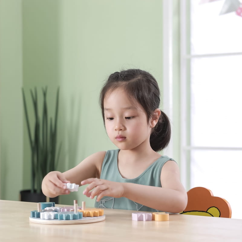 - Zębatki można układać na okrągłej tablicy z kołeczkami na wiele sposobów, co zapewnia kreatywną i rozwijającą zabawę.