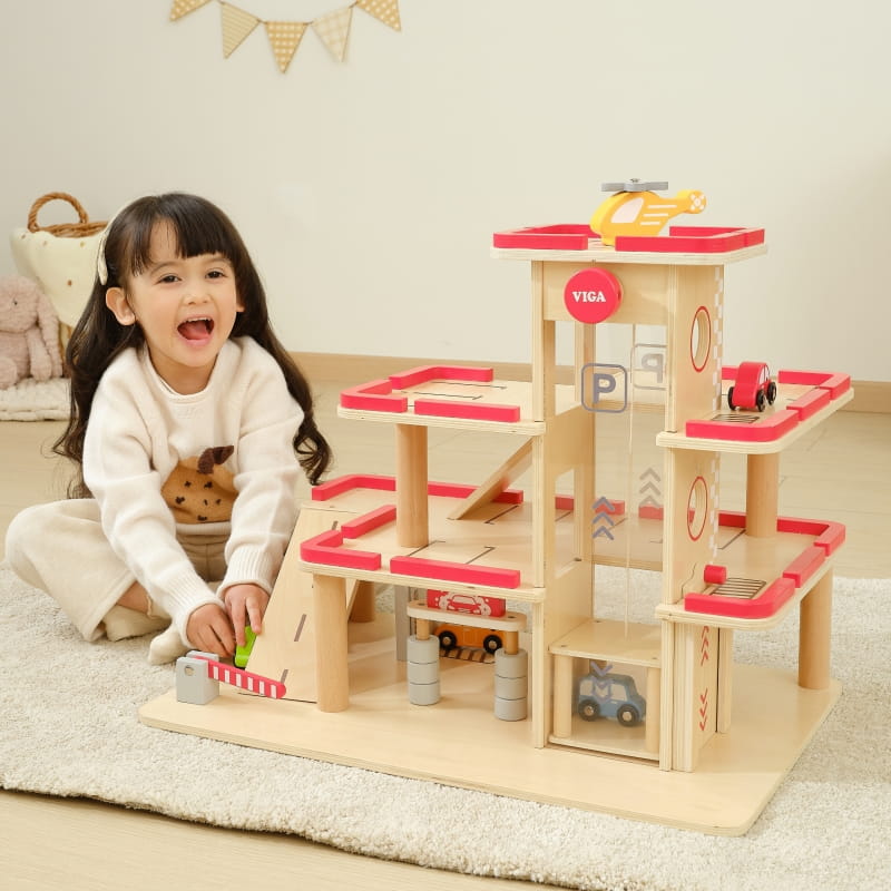 Jeśli szukasz drewnianego parkingu garażu dla dzieci, który łączy świetną zabawę z walorami edukacyjnymi, drewniany parking garaż Viga z windą, myjnią, 4 autkami i helikopterem będzie doskonałym wyborem na prezent dla przedszkolaka.