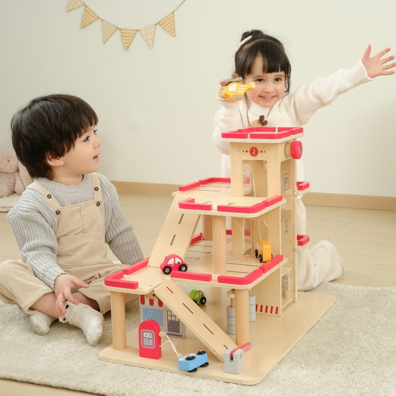 Drewniany Parking dla Samochodzików z Myjnią i Windą - 4 Autka + Helikopter
