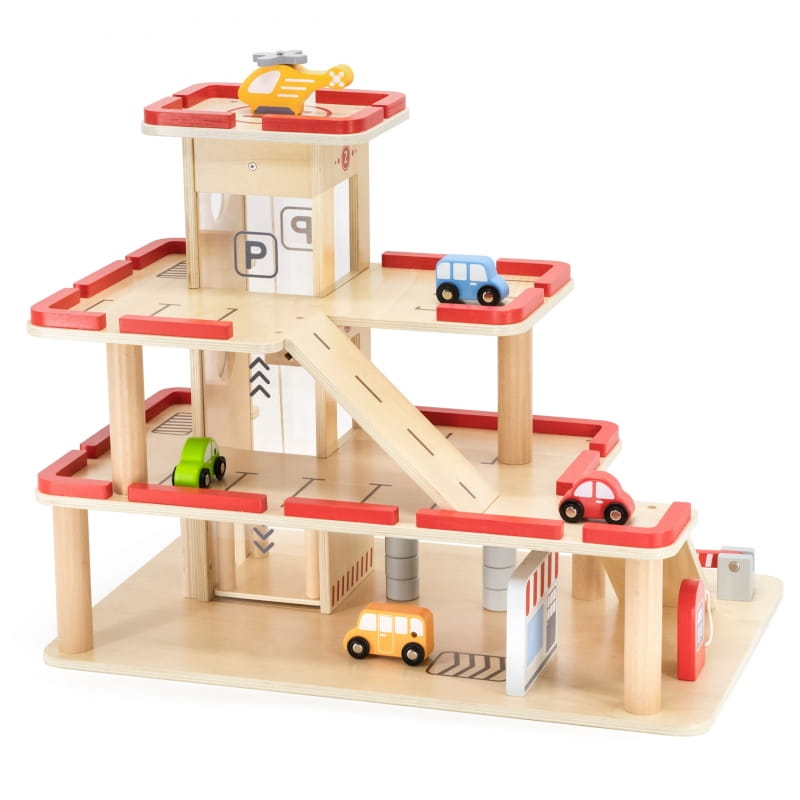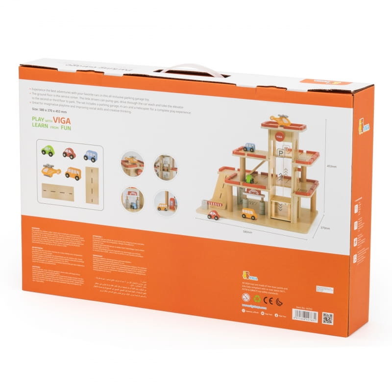Drewniany parking garaż Viga to duży, solidny zestaw dla dzieci od 3. roku życia, który łączy kreatywną zabawę z rozwojem wyobraźni, motoryki małej i umiejętności społecznych. Trzy poziomy parkowania, winda na korbkę, myjnia samochodowa oraz lądowisko dla helikoptera sprawiają, że jest to idealny parking dla małych fanów motoryzacji i lotnictwa.
